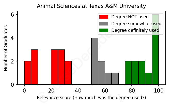 The verdict? Significantly below average. Overall, with an average relevance score of 54%, Animal Sciences graduates from Texas A&M University have a much lower likelihood (-13%) of finding work in this field compared to the average graduate across all fields: