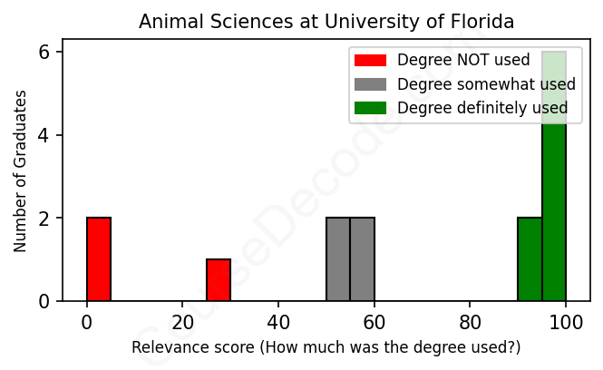 The verdict? Slightly above average. Overall, with an average relevance score of 68%, Animal Sciences graduates from University of Florida have a slightly higher likelihood (+1%) of finding work in this field compared to the average graduate across all fields: