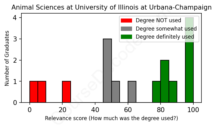 The verdict? Slightly below average. Overall, with an average relevance score of 63%, Animal Sciences graduates from University of Illinois at Urbana-Champaign have a slightly lower likelihood (-4%) of finding work in this field compared to the average graduate across all fields: