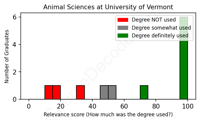 The verdict? Slightly above average. Overall, with an average relevance score of 68%, Animal Sciences graduates from University of Vermont have a slightly higher likelihood (+1%) of finding work in this field compared to the average graduate across all fields: