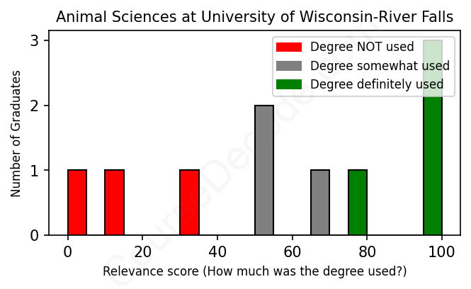 The verdict? Below average. Overall, with an average relevance score of 58%, Animal Sciences graduates from University of Wisconsin-River Falls have a lower likelihood (-9%) of finding work in this field compared to the average graduate across all fields: