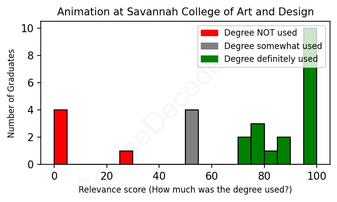 The verdict? Slightly above average. Overall, with an average relevance score of 68%, Animation graduates from Savannah College of Art and Design have a slightly higher likelihood (+1%) of finding work in this field compared to the average graduate across all fields: