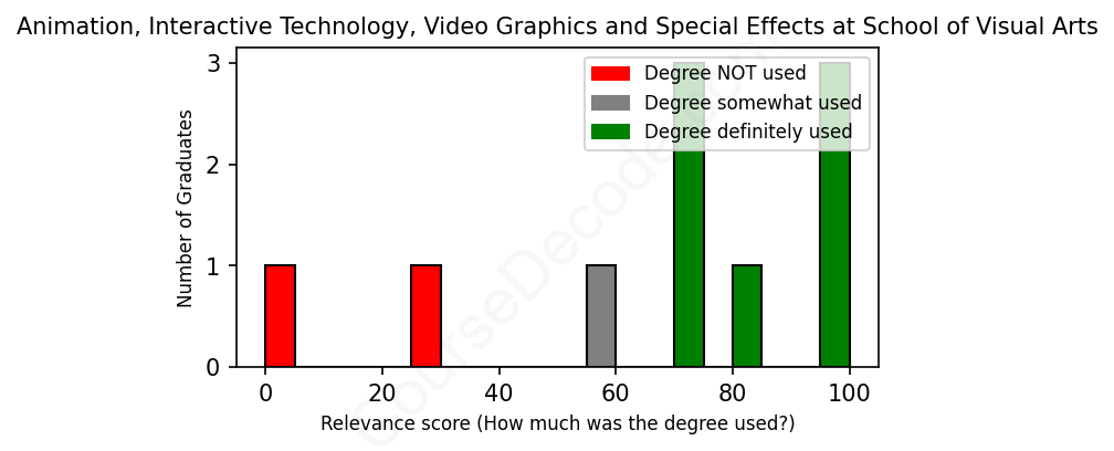 The verdict? Slightly above average. Overall, with an average relevance score of 68%, Animation, Interactive Technology, Video Graphics and Special Effects graduates from School of Visual Arts have a slightly higher likelihood (+1%) of finding work in this field compared to the average graduate across all fields: