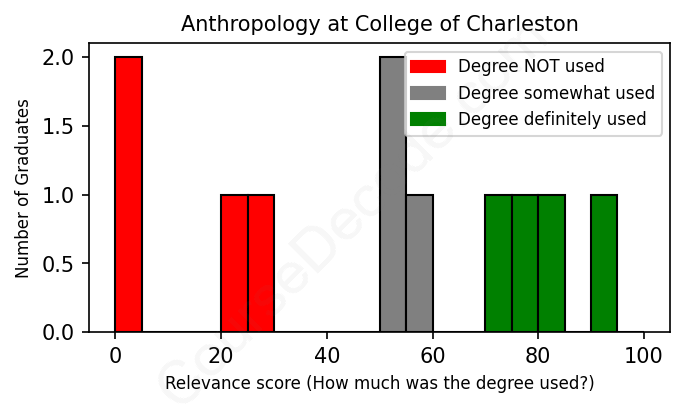 The verdict? Significantly below average. Overall, with an average relevance score of 47%, Anthropology graduates from College of Charleston have a much lower likelihood (-20%) of finding work in this field compared to the average graduate across all fields: