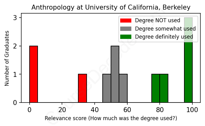 The verdict? Below average. Overall, with an average relevance score of 58%, Anthropology graduates from University of California, Berkeley have a lower likelihood (-9%) of finding work in this field compared to the average graduate across all fields: