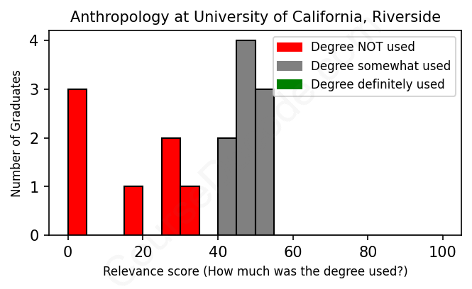 The verdict? Horrible! Overall, with an average relevance score of 33%, Anthropology graduates from University of California, Riverside have an exceptionally lower likelihood (-34%) of finding work in this field compared to the average graduate across all fields: