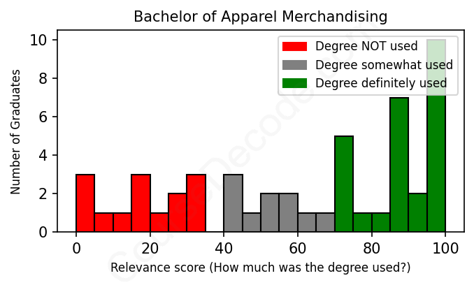 The verdict? Below average. Overall, with an average relevance score of 61%, Apparel Merchandising graduates have a lower likelihood (-6%) of finding work in this field compared to the average graduate across all fields: