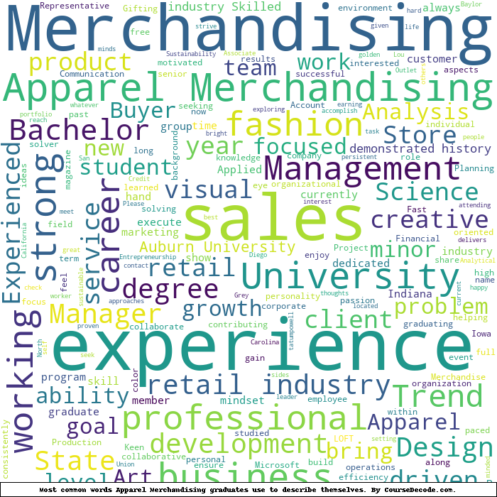Here is a visual representation of the most common words seen in the "about" section of LinkedIn profiles who have a Bachelor degree in Apparel Merchandising. This may or may not be useful: