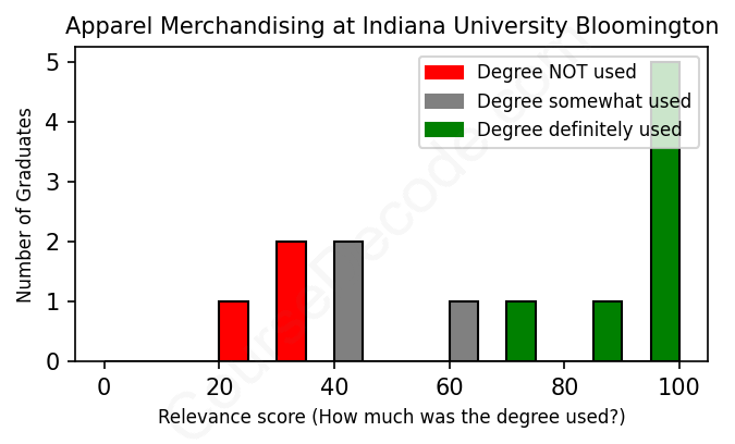 The verdict? Slightly above average. Overall, with an average relevance score of 68%, Apparel Merchandising graduates from Indiana University Bloomington have a slightly higher likelihood (+1%) of finding work in this field compared to the average graduate across all fields: