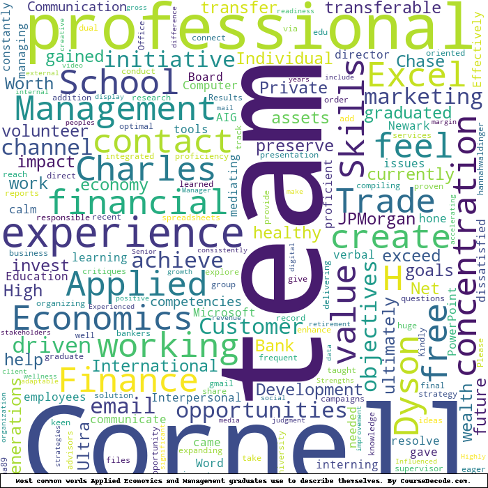 Here is a visual representation of the most common words seen in the "about" section of LinkedIn profiles who have a Bachelor degree in Applied Economics and Management (this is across all Applied Economics and Management graduates we've analyzed, not just those who went to Cornell University). This may or may not be useful: