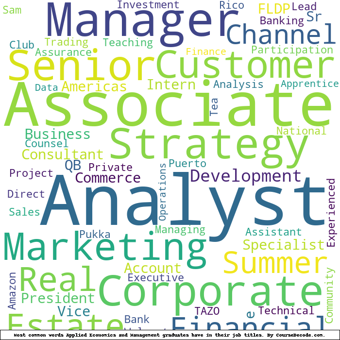 Here is a visual representation of the most common words in job titles for Applied Economics and Management graduates (this is across all Applied Economics and Management graduates we've analyzed, not just those who went to Cornell University):