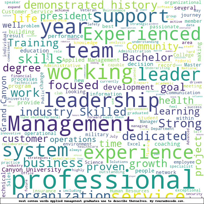 Here is a visual representation of the most common words seen in the "about" section of LinkedIn profiles who have a Bachelor degree in Applied Management. This may or may not be useful: