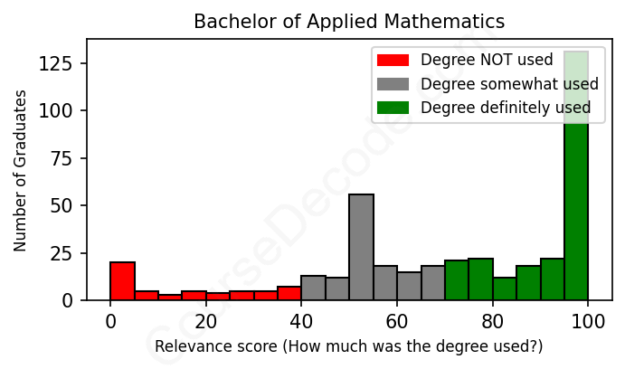 The verdict? Slightly above average. Overall, with an average relevance score of 69%, Applied Mathematics graduates have a slightly higher likelihood (+2%) of finding work in this field compared to the average graduate across all fields: