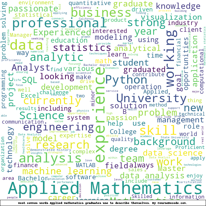 Here is a visual representation of the most common words seen in the "about" section of LinkedIn profiles who have a Bachelor degree in Applied Mathematics. This may or may not be useful: