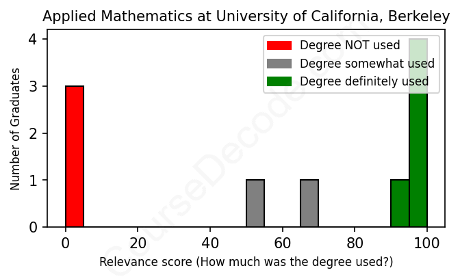 The verdict? Below average. Overall, with an average relevance score of 60%, Applied Mathematics graduates from University of California, Berkeley have a lower likelihood (-7%) of finding work in this field compared to the average graduate across all fields: