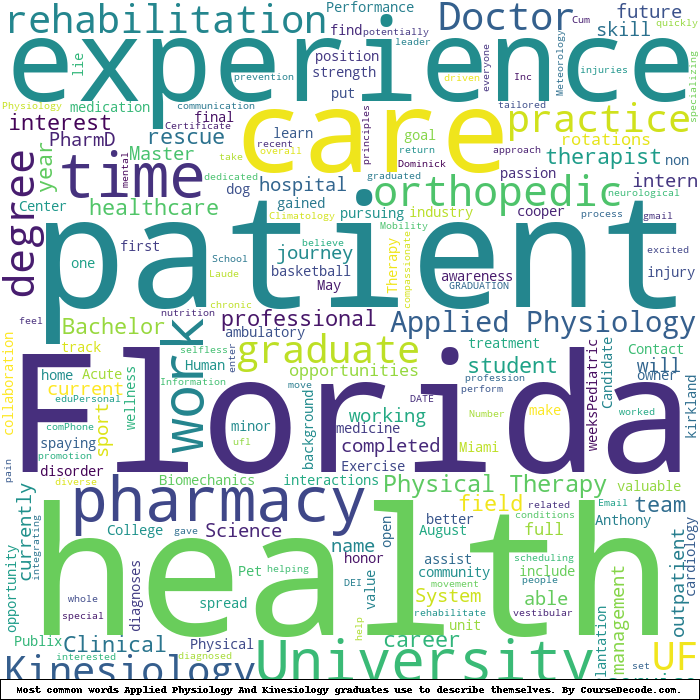 Here is a visual representation of the most common words seen in the "about" section of LinkedIn profiles who have a Bachelor degree in Applied Physiology And Kinesiology (this is across all Applied Physiology And Kinesiology graduates we've analyzed, not just those who went to University of Florida). This may or may not be useful: