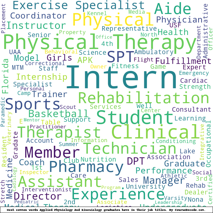 Here is a visual representation of the most common words in job titles for Applied Physiology And Kinesiology graduates (this is across all Applied Physiology And Kinesiology graduates we've analyzed, not just those who went to University of Florida):