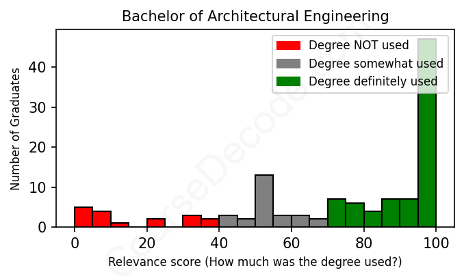 The verdict? Above average. Overall, with an average relevance score of 73%, Architectural Engineering graduates have a higher likelihood (+6%) of finding work in this field compared to the average graduate across all fields: