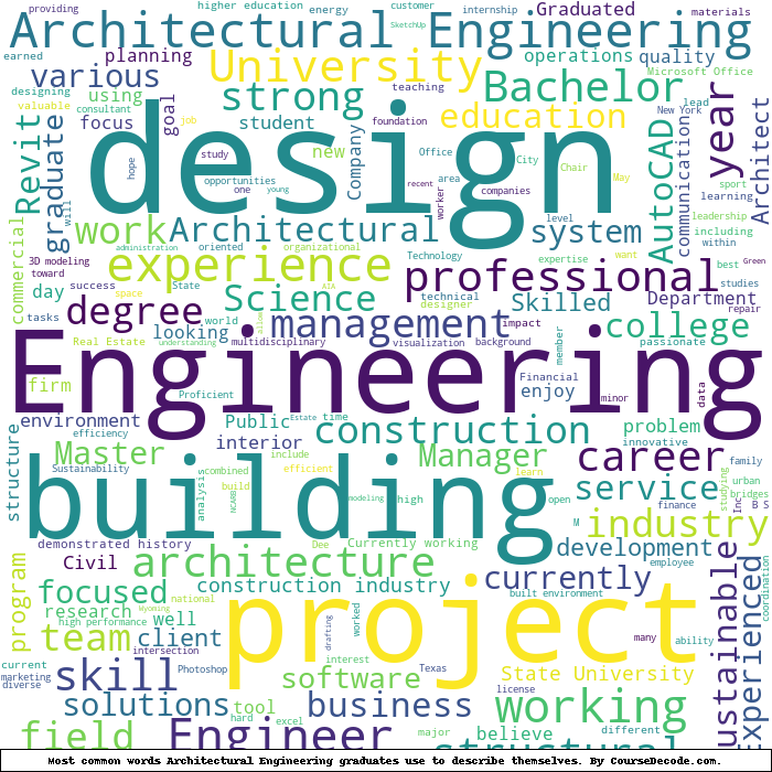 Here is a visual representation of the most common words seen in the "about" section of LinkedIn profiles who have a Bachelor degree in Architectural Engineering. This may or may not be useful: