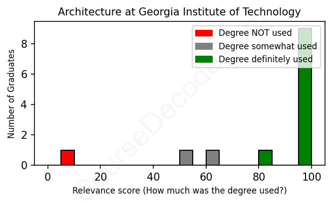 The verdict? Significantly above average. Overall, with an average relevance score of 84%, Architecture graduates from Georgia Institute of Technology have a much higher likelihood (+17%) of finding work in this field compared to the average graduate across all fields:
