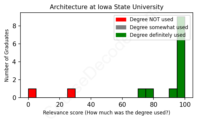 The verdict? Significantly above average. Overall, with an average relevance score of 83%, Architecture graduates from Iowa State University have a much higher likelihood (+16%) of finding work in this field compared to the average graduate across all fields: