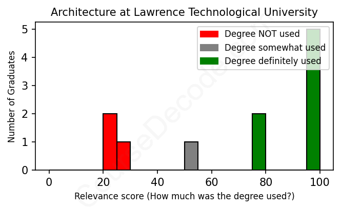 The verdict? Slightly above average. Overall, with an average relevance score of 69%, Architecture graduates from Lawrence Technological University have a slightly higher likelihood (+2%) of finding work in this field compared to the average graduate across all fields: