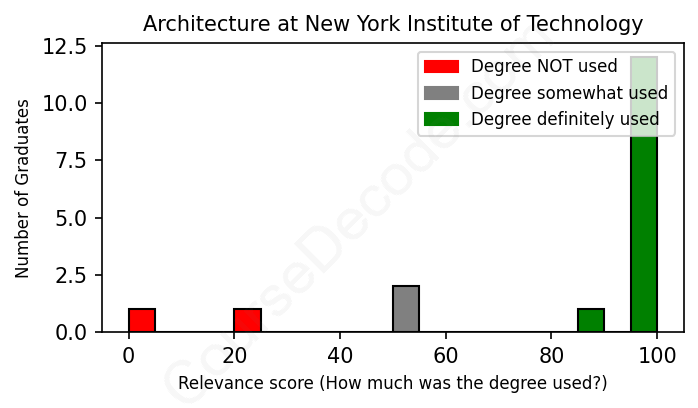 The verdict? Significantly above average. Overall, with an average relevance score of 82%, Architecture graduates from New York Institute of Technology have a much higher likelihood (+15%) of finding work in this field compared to the average graduate across all fields: