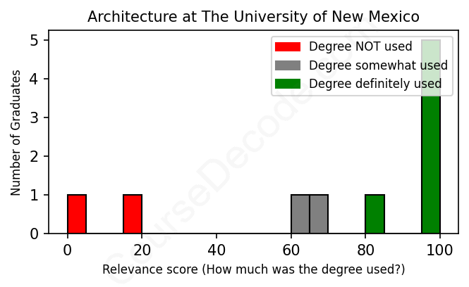 The verdict? Slightly above average. Overall, with an average relevance score of 72%, Architecture graduates from The University of New Mexico have a slightly higher likelihood (+5%) of finding work in this field compared to the average graduate across all fields: