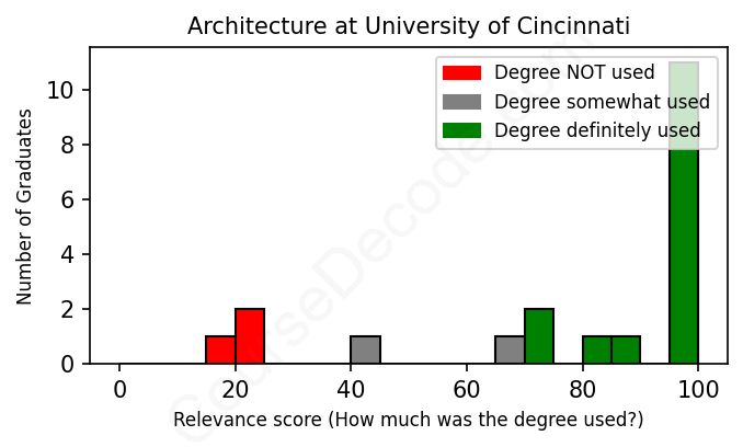 The verdict? Significantly above average. Overall, with an average relevance score of 79%, Architecture graduates from University of Cincinnati have a much higher likelihood (+12%) of finding work in this field compared to the average graduate across all fields: