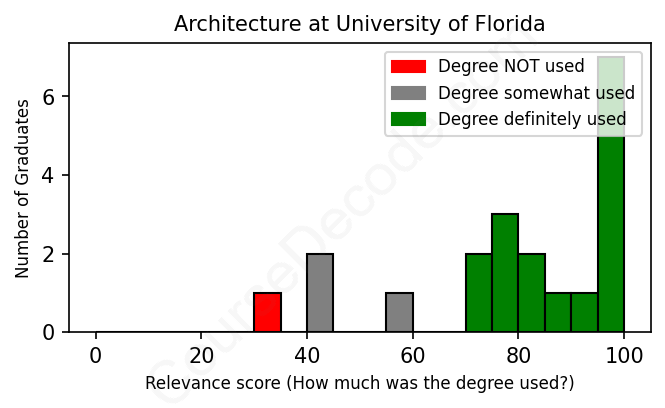 The verdict? Significantly above average. Overall, with an average relevance score of 78%, Architecture graduates from University of Florida have a much higher likelihood (+11%) of finding work in this field compared to the average graduate across all fields: