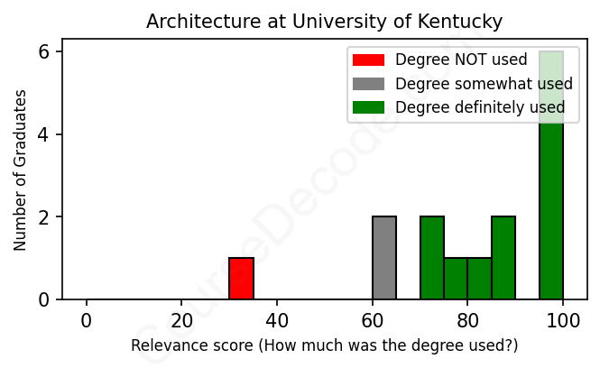 The verdict? Significantly above average. Overall, with an average relevance score of 82%, Architecture graduates from University of Kentucky have a much higher likelihood (+15%) of finding work in this field compared to the average graduate across all fields:
