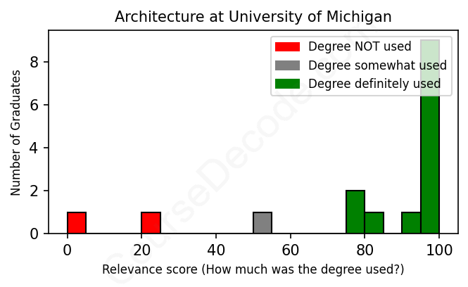 The verdict? Significantly above average. Overall, with an average relevance score of 81%, Architecture graduates from University of Michigan have a much higher likelihood (+14%) of finding work in this field compared to the average graduate across all fields: