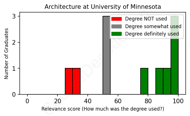 The verdict? Slightly above average. Overall, with an average relevance score of 69%, Architecture graduates from University of Minnesota have a slightly higher likelihood (+2%) of finding work in this field compared to the average graduate across all fields: