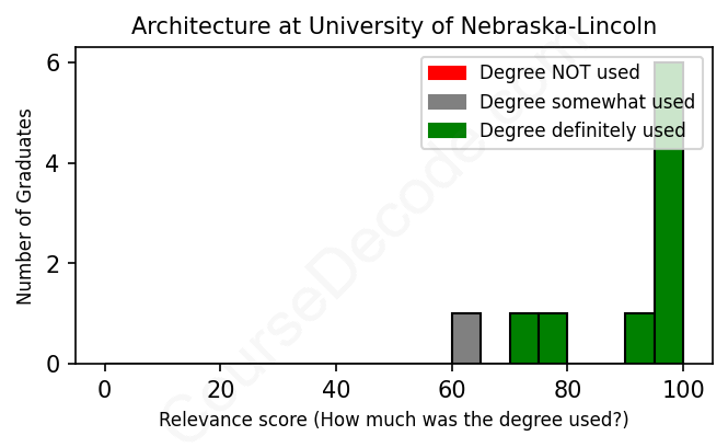 The verdict? Great! Overall, with an average relevance score of 89%, Architecture graduates from University of Nebraska-Lincoln have a substantially higher likelihood (+22%) of finding work in this field compared to the average graduate across all fields: