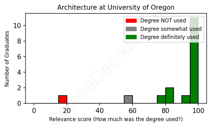 The verdict? Great! Overall, with an average relevance score of 88%, Architecture graduates from University of Oregon have a substantially higher likelihood (+21%) of finding work in this field compared to the average graduate across all fields: