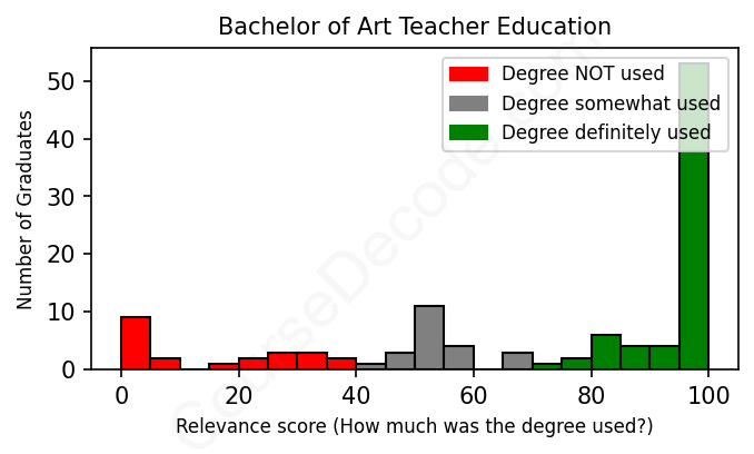The verdict? Slightly above average. Overall, with an average relevance score of 72%, Art Teacher Education graduates have a slightly higher likelihood (+5%) of finding work in this field compared to the average graduate across all fields: