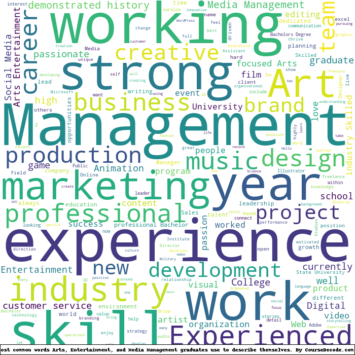 Here is a visual representation of the most common words seen in the "about" section of LinkedIn profiles who have a Bachelor degree in Arts, Entertainment, and Media Management. This may or may not be useful: