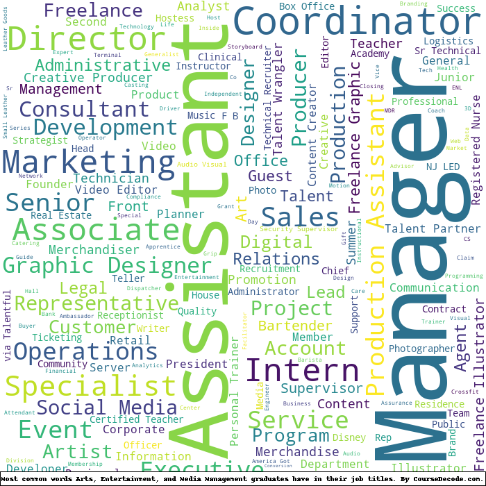 Here is a visual representation of the most common words in job titles for Arts, Entertainment, and Media Management graduates: