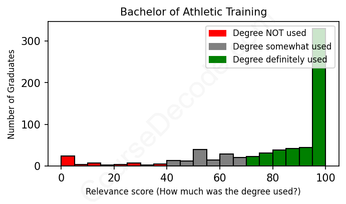 The verdict? Significantly above average. Overall, with an average relevance score of 80%, Athletic Training graduates have a much higher likelihood (+13%) of finding work in this field compared to the average graduate across all fields: