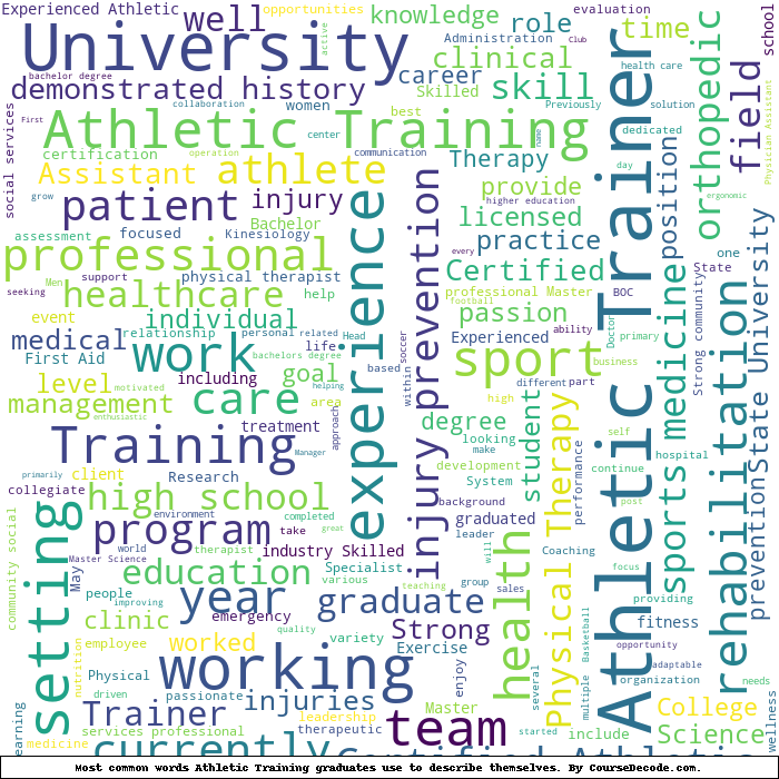 Here is a visual representation of the most common words seen in the "about" section of LinkedIn profiles who have a Bachelor degree in Athletic Training. This may or may not be useful: