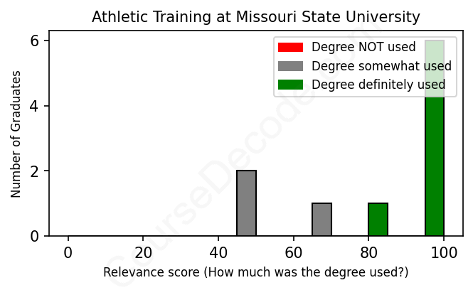 The verdict? Significantly above average. Overall, with an average relevance score of 84%, Athletic Training graduates from Missouri State University have a much higher likelihood (+17%) of finding work in this field compared to the average graduate across all fields: