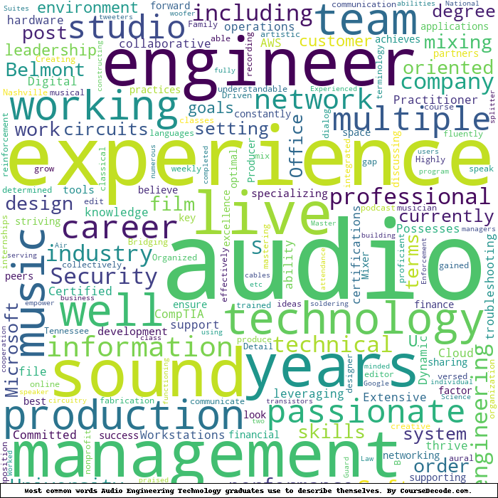 Here is a visual representation of the most common words seen in the "about" section of LinkedIn profiles who have a Bachelor degree in Audio Engineering Technology (this is across all Audio Engineering Technology graduates we've analyzed, not just those who went to Belmont University). This may or may not be useful: