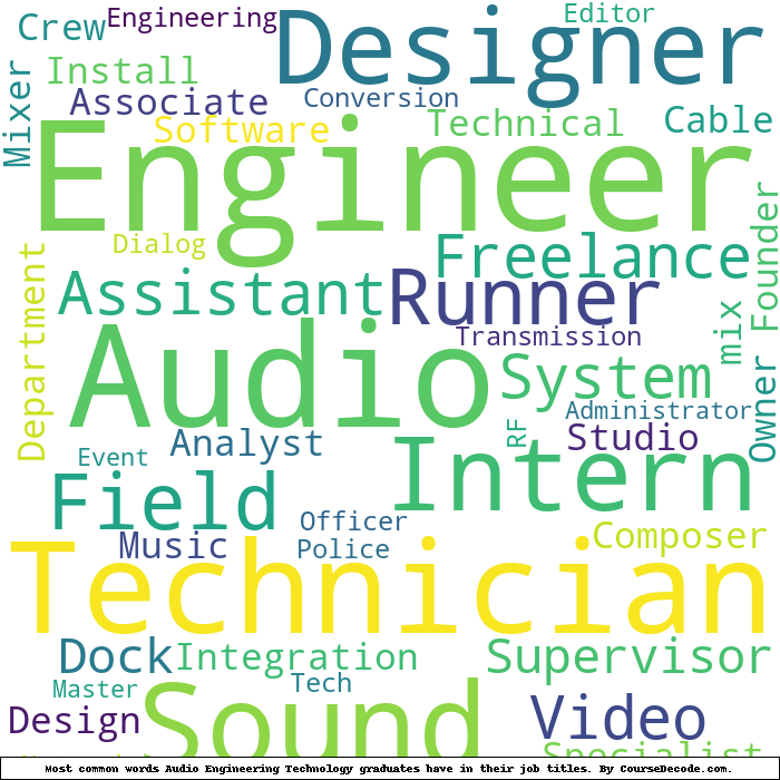 Here is a visual representation of the most common words in job titles for Audio Engineering Technology graduates (this is across all Audio Engineering Technology graduates we've analyzed, not just those who went to Belmont University):