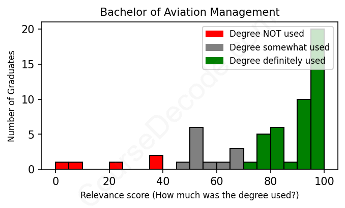 The verdict? Significantly above average. Overall, with an average relevance score of 78%, Aviation Management graduates have a much higher likelihood (+11%) of finding work in this field compared to the average graduate across all fields: