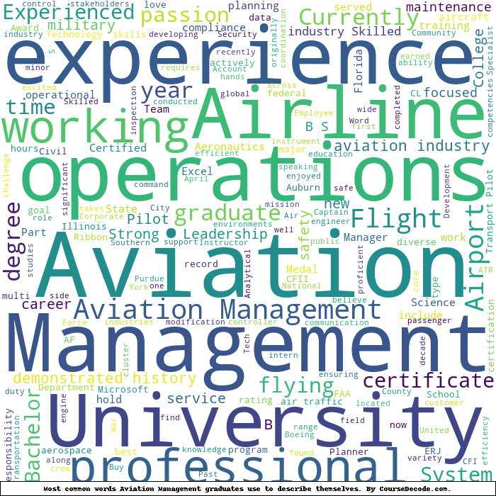 Here is a visual representation of the most common words seen in the "about" section of LinkedIn profiles who have a Bachelor degree in Aviation Management. This may or may not be useful:
