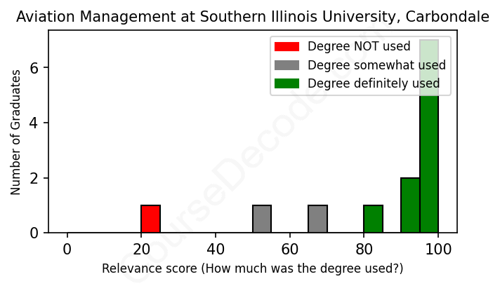 The verdict? Significantly above average. Overall, with an average relevance score of 84%, Aviation Management graduates from Southern Illinois University, Carbondale have a much higher likelihood (+17%) of finding work in this field compared to the average graduate across all fields:
