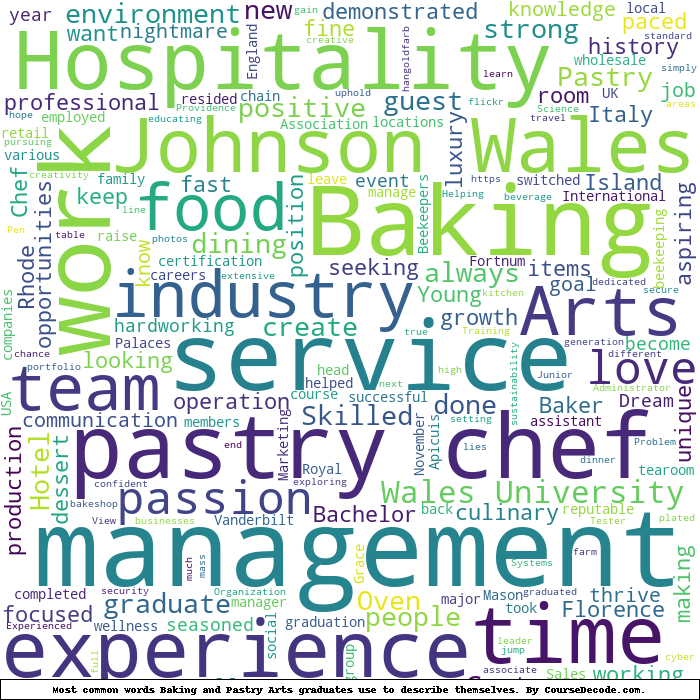 Here is a visual representation of the most common words seen in the "about" section of LinkedIn profiles who have a Bachelor degree in Baking and Pastry Arts (this is across all Baking and Pastry Arts graduates we've analyzed, not just those who went to Johnson & Wales University). This may or may not be useful: