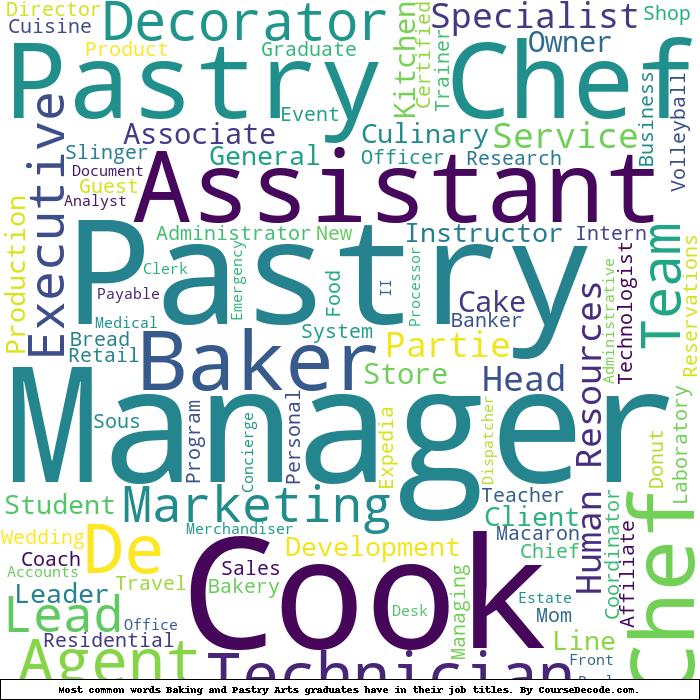 Here is a visual representation of the most common words in job titles for Baking and Pastry Arts graduates (this is across all Baking and Pastry Arts graduates we've analyzed, not just those who went to Johnson & Wales University):