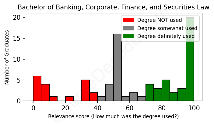 First, some facts. Of the Banking, Corporate, Finance, and Securities Law graduates we've analyzed , here's how many have used (or NOT used) their degree in their career: