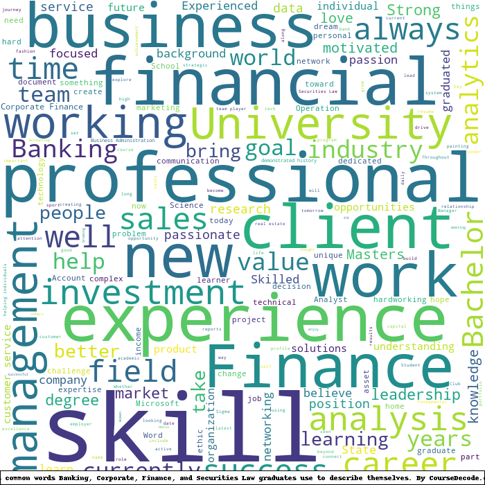 Here is a visual representation of the most common words seen in the "about" section of LinkedIn profiles who have a Bachelor degree in Banking, Corporate, Finance, and Securities Law. This may or may not be useful: